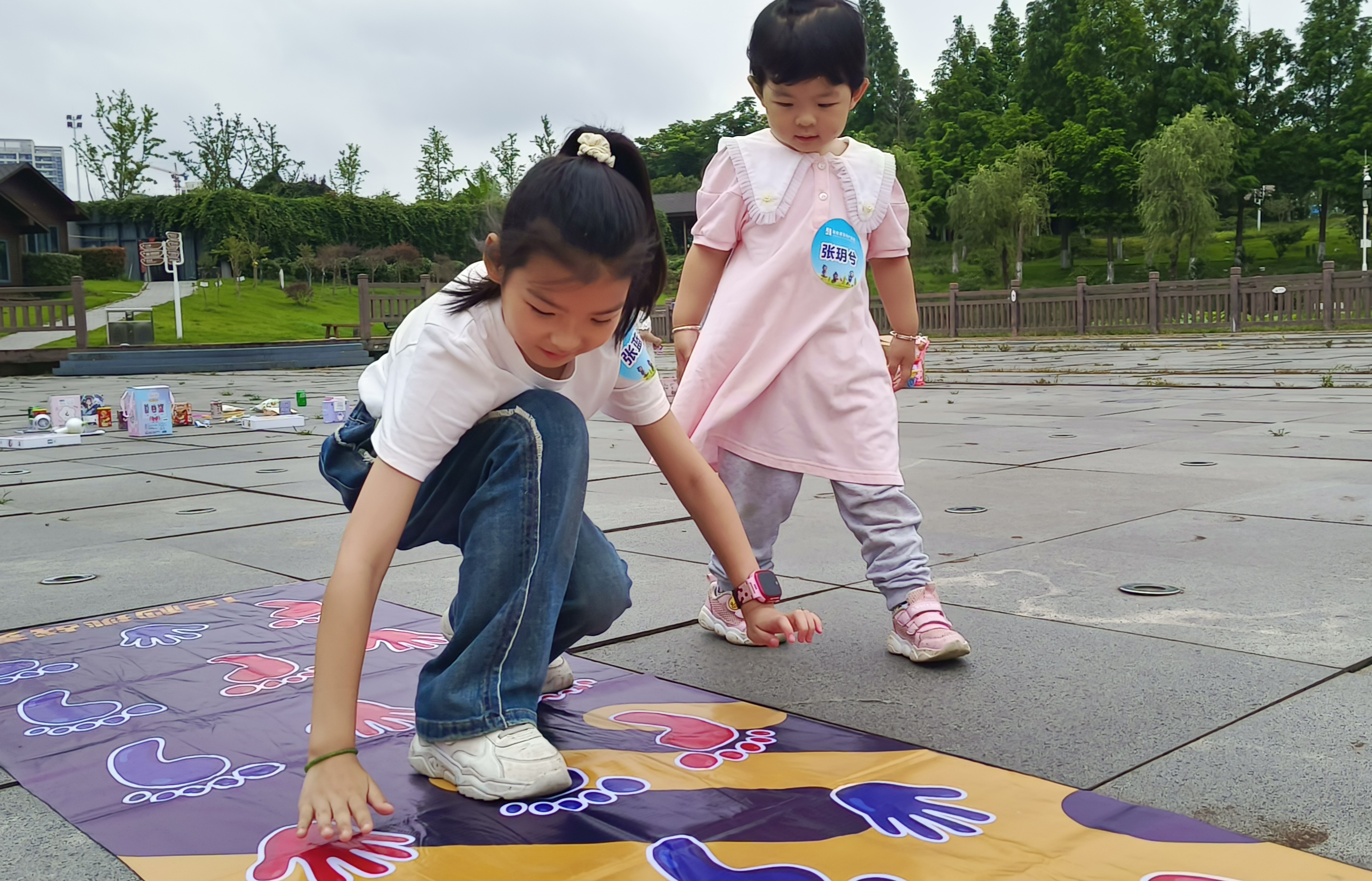 “手腳并用”游戲頗具挑戰(zhàn)性,要求孩子們俯身貼地,用他們的手掌和腳掌貼合塑料布上的圖形,而且左右手腳不能有絲毫偏差。這一游戲難度不小,需要孩子們具備良好的身體協(xié)調(diào)性,稍有不慎便可能失去平衡,摔倒在地。